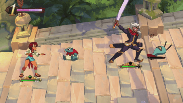 The aspect of Indivisible that rubbed me the wrong way at first was its combat. What doesn’t show in these screenshots is that it’s not driven by a turn-based system, per se. Each of your characters gets a certain number of actions that can be triggered at almost any time and in any order.