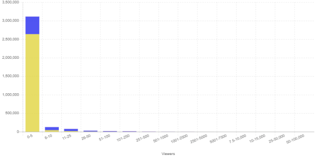 The vast majority of active streamers broadcast to an average of 0-5 viewers