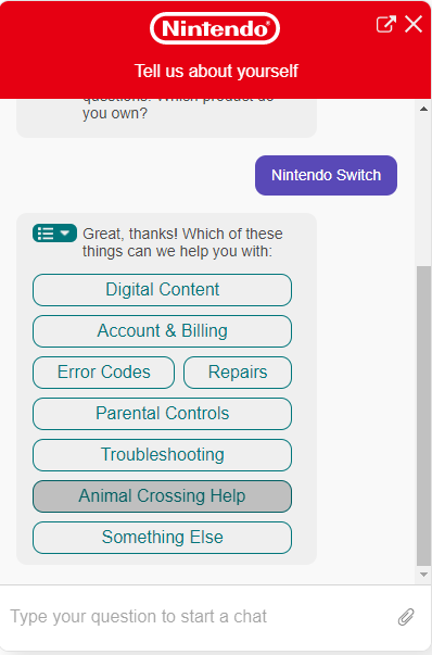 5. Contact Nintendo support. You can reach out via email, phone, or live chat. We went with live chat, as it doesn’t require us to speak to a human being on the phone. Also, our live chat gave us the option to specifically request for Animal Crossing help.