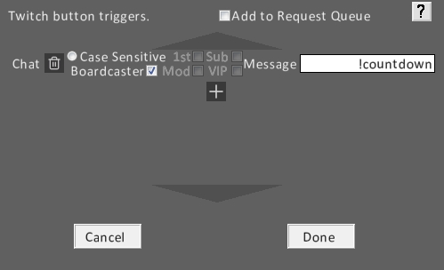 4. Back on the deck, click on your countdown button and select “Add Twitch Triggers”. Add a chat command and use whatever message you want as the trigger. I personally use “!countdown”. I also configure the command so that only I can use it, but maybe you want viewers or mods to have the ability to trigger the countdown as well. Go with what works best for you. Select “Done” when you’re finished.