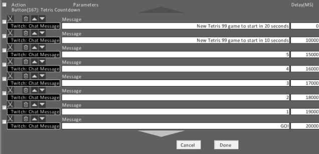 3. With the button properly labeled, select Edit Commands. From here, you’ll add a series of “Twitch: Chat Message” commands, which will be the messages your bot says when it’s counting down. I like to start with a message for 20 seconds, 10 seconds, and the. Counting down from five-to-one with it ending on go. In the Delay(MS) column, specify the number of milliseconds between each command so that the messages fire off at the right time. If you’d like, feel free to copy my exact settings pictured above. Hit “Done”.