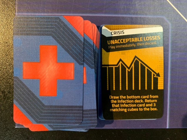 This iteration of Pandemic retains much of what makes the original so great, from its emphasis on teamwork to the drama created by the diseases spreading. However, veterans will notice that the new game is surprisingly easy when played straight up. If you’re looking for a challenge fitting for experienced players, I strongly recommend adding all of the new Crisis cards to the player deck. When drawn, these cards trigger negative effects, such as shortening hand limits or increasing the spread of diseases. One particular Crisis card causes the infection phase to occur twice-in-a-row. If you draw that card when the infection track is at four, it’s almost certainly game over!
