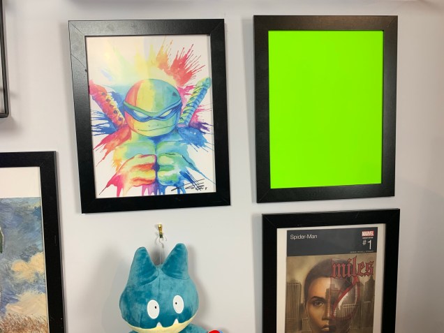 I don’t use a full-blown green screen, but I recently implemented a green screen frame. Cutting a piece of Bristol board and placing it in a frame, I now have the ability to display digital images, video, and chat emotes within that frame. It creates a really cool hybrid of the physical and digital worlds!