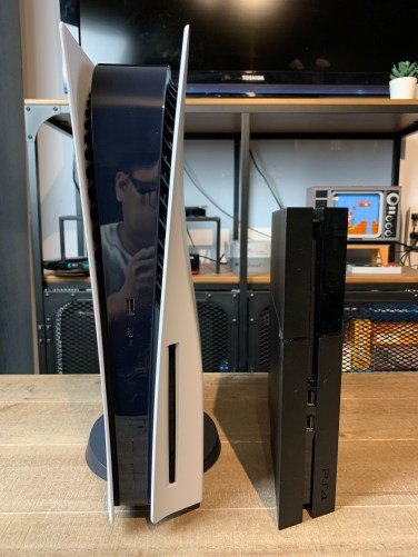 One last look at the console. This time, standing shoulder-to-head with the PlayStation 4. The PlayStation 5 is really a monster in size by comparison. Odds are, many will have to rethink their desks and media setups to accommodate for how much larger this thing is compared to other consoles, cable boxes, or DVD players. I had to reinstall a shelf meant for desktop towers onto my desk to make this fit within my setup!