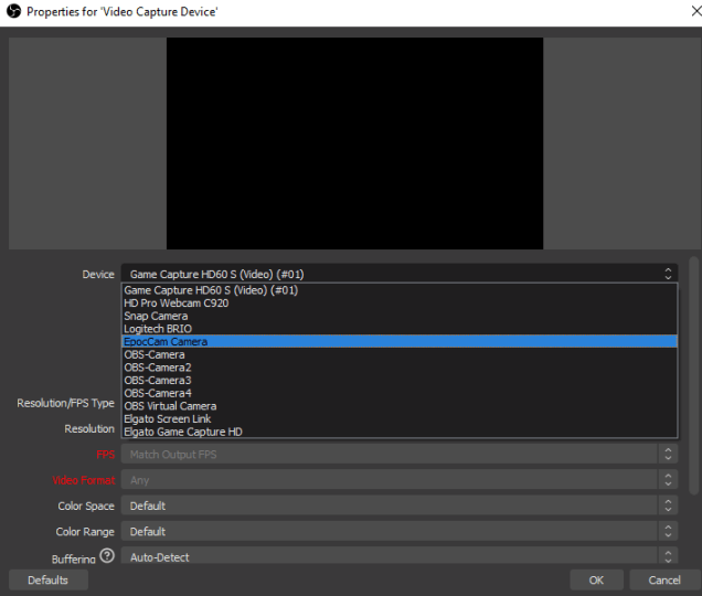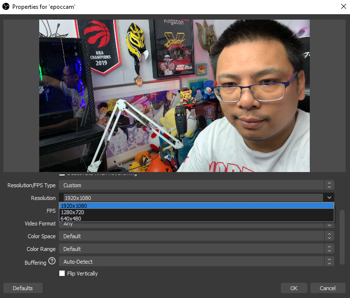 4. When you buy the paid version, it will still default to 480 resolution. In OBS, go to the Properties of your EpocCam and set the resolution to 720 or 1080. I personally use 1080, but go with the resolution that works best for you.