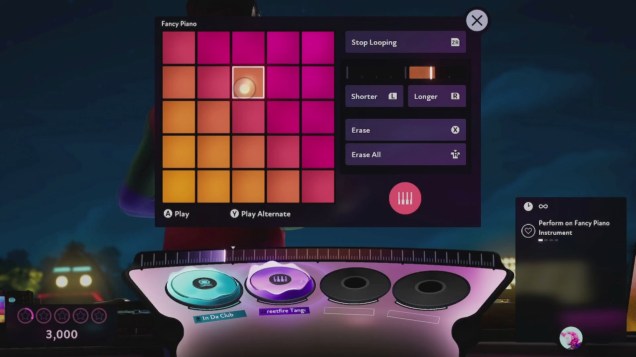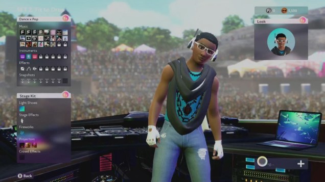 Each track is broken into records that contain one of its four components: drums, bass, melody, and vocals. Using the four turntables, you can mix-and-match components of different songs to create your own mash-ups. From there, you can keep the crowd dancing by subbing in new components, soloing parts, adding effects to modulate the sound, and even adding your own instrument loops with the in-game DJ pads controller.