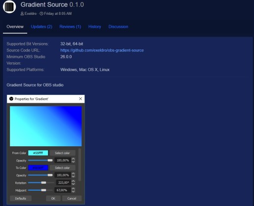 1. Download and install OBS Gradient Source. This plugin adds the the ability to create gradient sources in OBS. I recommend downloading the .zip file with the installer instead of manually uploading the files to the proper directory yourself.