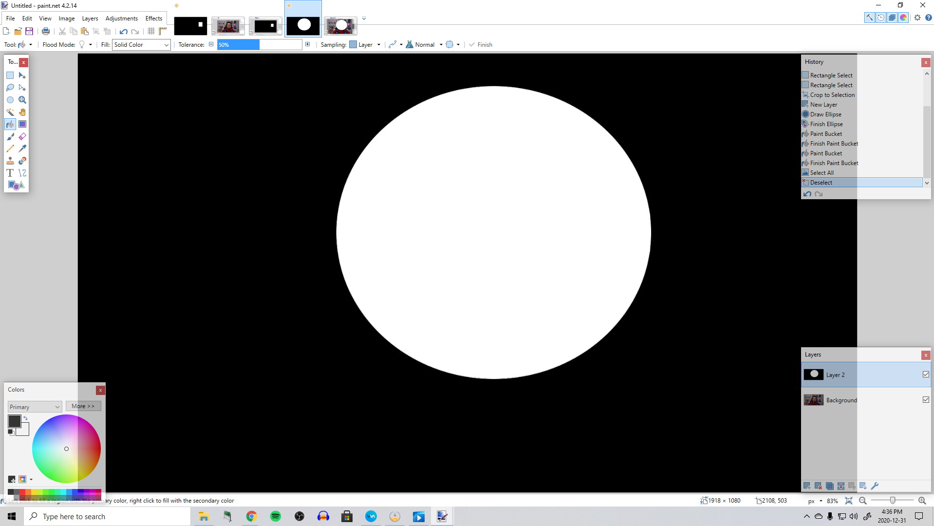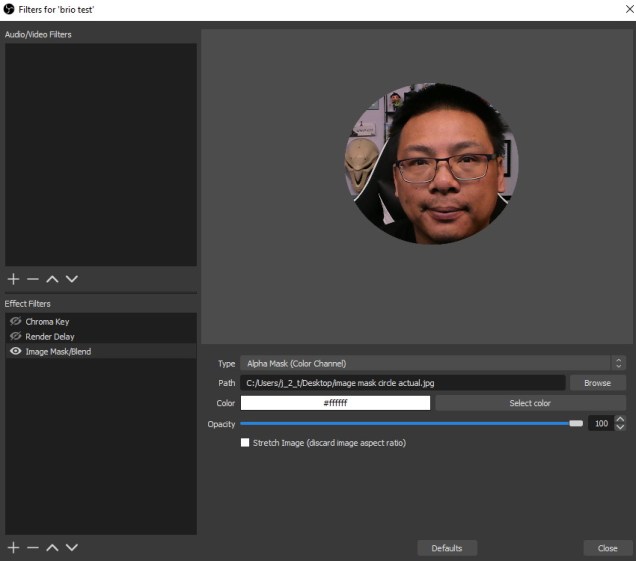 4. The screenshot you took will act as a reference for creating the image mask. Image masks allow you to show or hide any part of a source based on the mask that you apply. In the above example, I wanted my face to appear in a circle. As such, I drew a circle and filled the area in white. You can create whatever shapes you like, as long as you know that the white areas of your image mask will show through in OBS while the black areas are cropped out.
