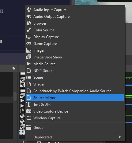 9. Add a new source. Thanks to StreamFX, you should have a new source called Source Mirror. This source allows you to make a duplicate version of a source that can be modified without altering the original. Within Source Mirror, add your camera view.