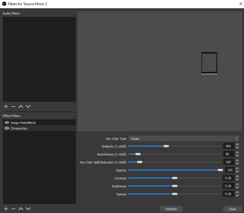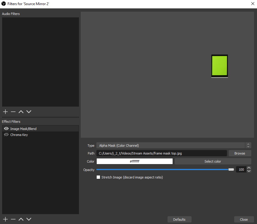 10. Select the Source Mirror version of your camera in OBS. Right click and select “Filters”. Add “Image Mask/Blend”. Then under “Path”, select the image mask file you created. If you’ve done it correctly, you should only see the area with you green screen. Don’t worry if it doesn’t crop exactly to fit your green screen as long as the viewable area shows your green screen in full.