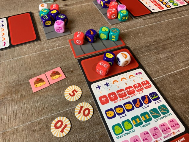 Hands may change, but you have the option to modify them to your benefit. Cashing in menu tokens allows you to reroll any number of dice in your hand one time. Though it doesn’t always work out, it gives you a shot at landing those exact items you need. I personally always reroll for sashimi, which have the highest scoring potential but are worthless if you only have one. You can also use chopsticks to swap a die on your conveyer belt with one from another belt. Having this extra bit of control helps to mitigate a bit of the randomness while giving you a few more strategic options.