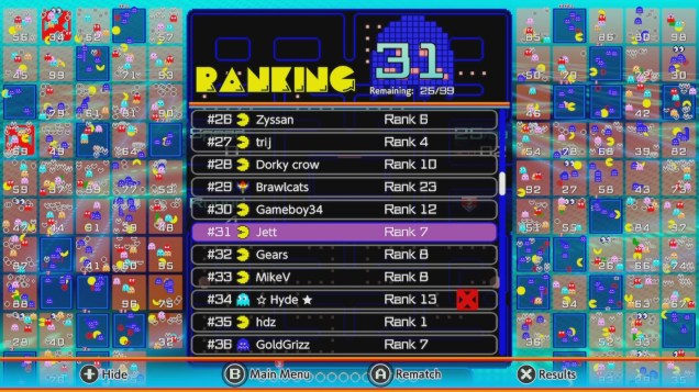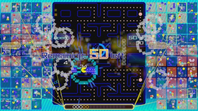 As with Tetris 99 and Super Mario Bros. 35, players aren’t keeping to themselves. When you eat ghosts, you’ll send Jammers to your opposition. Jammers are white Pac-Men that slow down Pac-Man on contact. Later in the match, red Jammers can be sent, which are actually lethal. Though you’re free to target a specific opponent, I lean heavily on the right stick targeting system that allows you to pick between random opponents, the opponent with the most badges, the person closest to losing, or counter everyone attacking you.