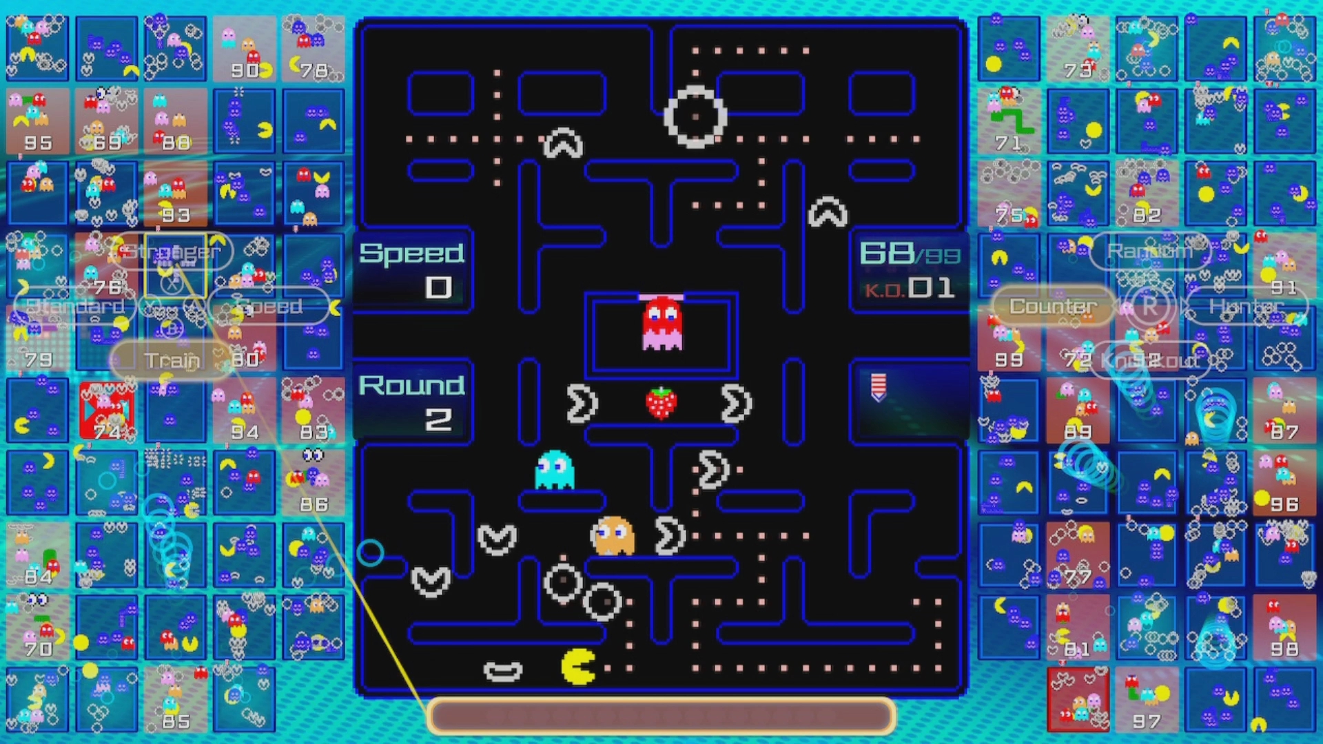 As with Tetris 99 and Super Mario Bros. 35, players aren’t keeping to themselves. When you eat ghosts, you’ll send Jammers to your opposition. Jammers are white Pac-Men that slow down Pac-Man on contact. Later in the match, red Jammers can be sent, which are actually lethal. Though you’re free to target a specific opponent, I lean heavily on the right stick targeting system that allows you to pick between random opponents, the opponent with the most badges, the person closest to losing, or counter everyone attacking you.