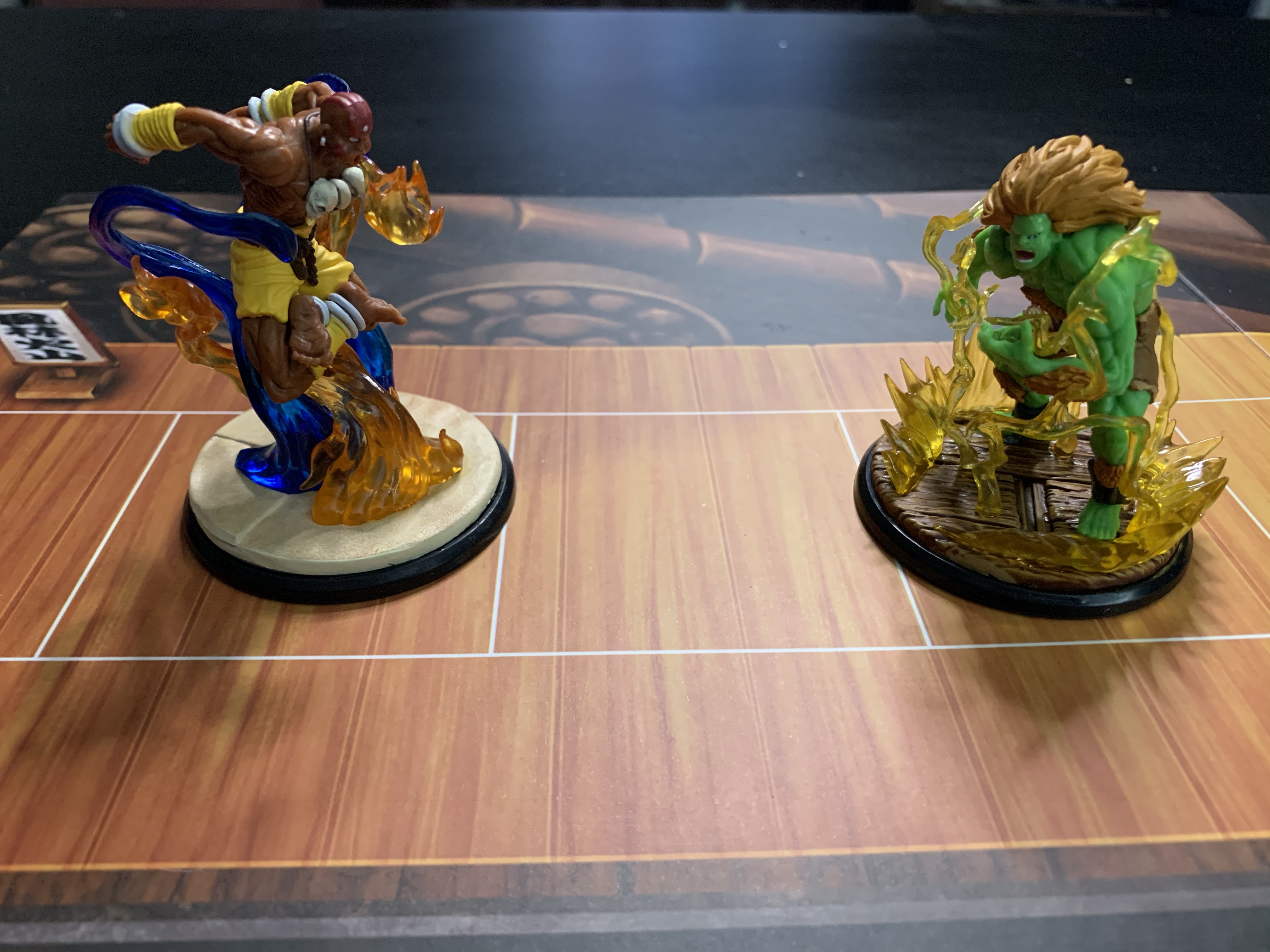 One of the more provocative design choices that the board game makes is that combat is played on a “3D” battlefield. While one could house rule the base game so that combat is only played across one row, the stretch goals box comes with Ryu and Ken’s stage as a 2D battlefield. Really nice touch for players wanting to play the game in a way that feels more like the video game.