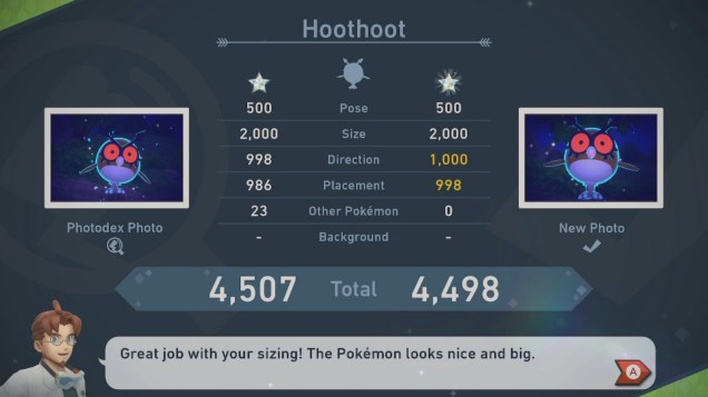 One way in which the game extends the experience is that your Photodex has four photo slots for each Pokemon. You still submit one photo per run, but photos are first graded on a star system based on how unique of a shot it is. The game is really fuzzy on exactly what constitutes a photo being in a specific category, especially since a four-star photo doesn’t guarantee that you’ll get a good score. Nevertheless, it ultimately works as a means of allowing you to keep four photos of a Pokemon versus one, while giving you more reasons to snap the same Pokemon.