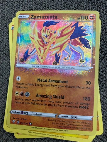 When we opened it, we found an Amazing Rare holo Zamazenta. Though it’s far from the most expensive card on the market, its current market price is higher than what we paid for the pack. Score!