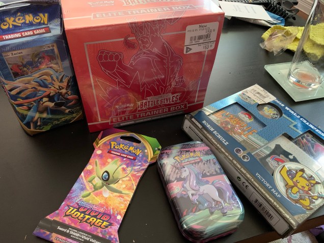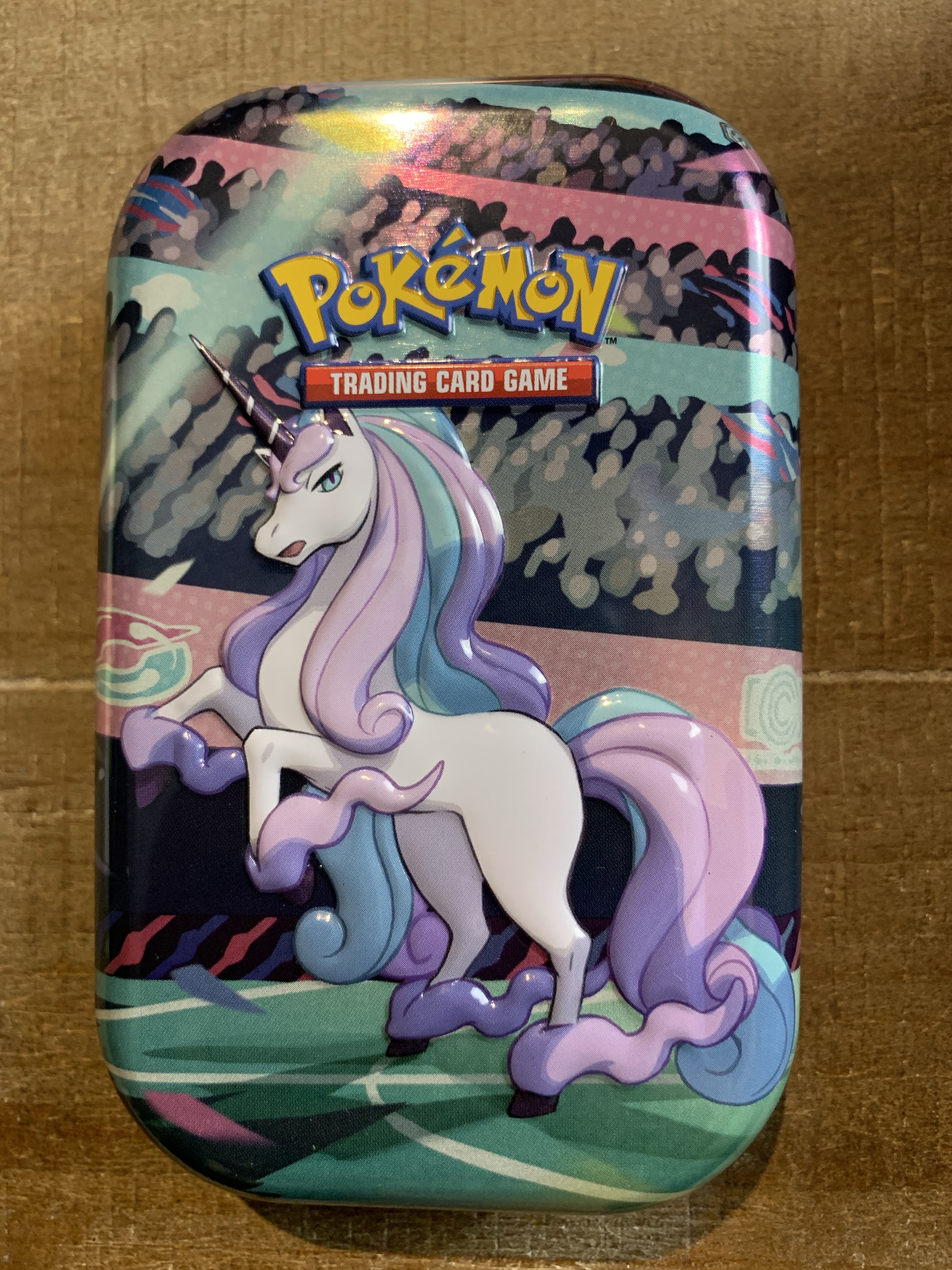 Oh hey! There’s a tin with Galarian Rapidash on it! Isn’t it so pretty? It even comes with two booster packs inside, and the cost of buying two boosters is about the same as getting this tin. And we might have gotten another Vivid Voltage booster too.