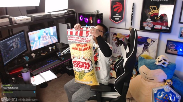 I also use secondary cameras to capture things that my main camera can’t. On a past stream, I showcased a gigantic bag of popcorn my wife and I bought at Costco. Thanks to my room cam that’s mounted on a shelf behind me, the zoomed out view gave viewers a much better sense of how big this bag of popcorn actually was.