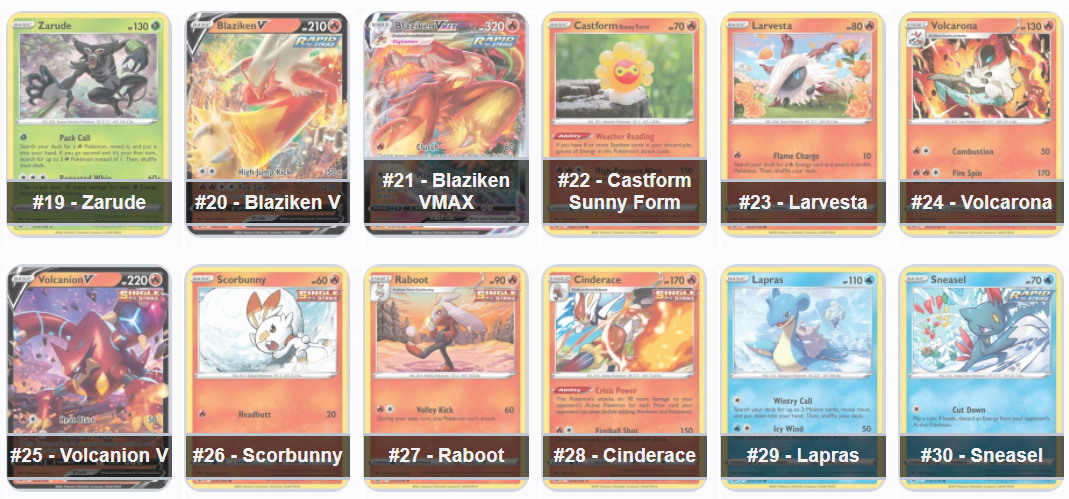 The Chilling Reign set is rife with water cards (18) and psychic cards (22). But other sets aren’t as stuffed. Fire and electric get the shortest end of the stick, with only nine and seven cards apiece. Add to that the mechanics around evolutions, and there are like, 3-4 evolution lines each in fire and electric.