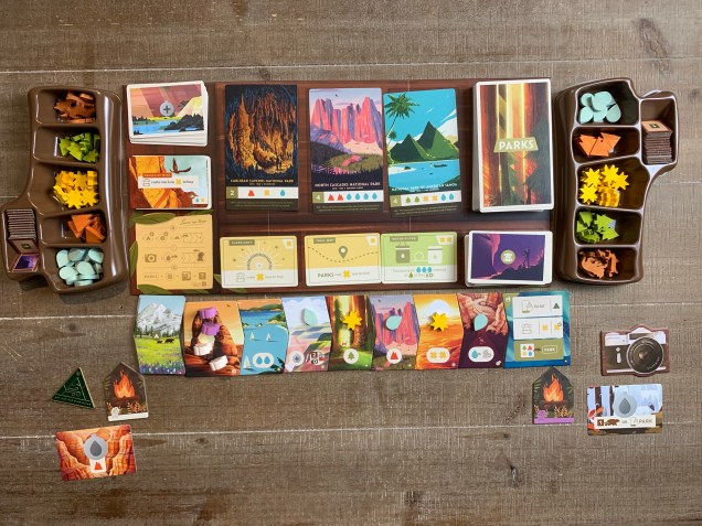 Most importantly, your tokens can be cashed in to visit a national park. Parks cost a lot of tokens, but they’re going to make up the brunt of one’s scoring. Also, for a game that is beautifully designed and presented, the parks cards are easily the highlight. Gorgeous art inspired by the 1950s adorns every card while also featuring a factoid about that park. Every national park is represented here, which further adds to the idea of trekking through the wilderness.