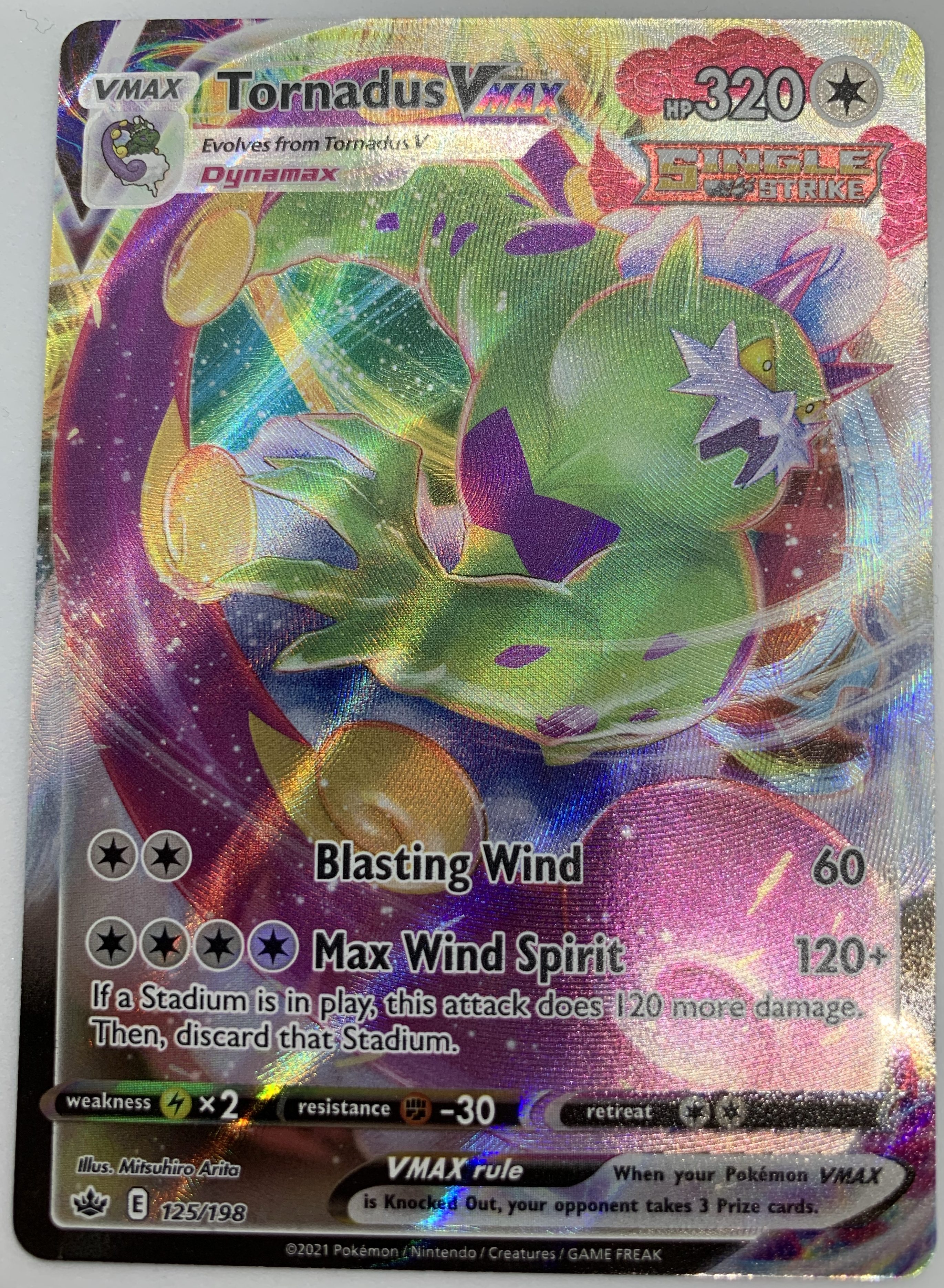 Tornadus VMax was the first VMax card we pulled from the booster box. Its usefulness on the battlefield is a bit finicky, as you need to have a stadium in play to squeeze out its max potential of 40 damage. However, if you can build a deck with lots of stadium cards and double colourless energy, Tornadus VMax could be a beast!