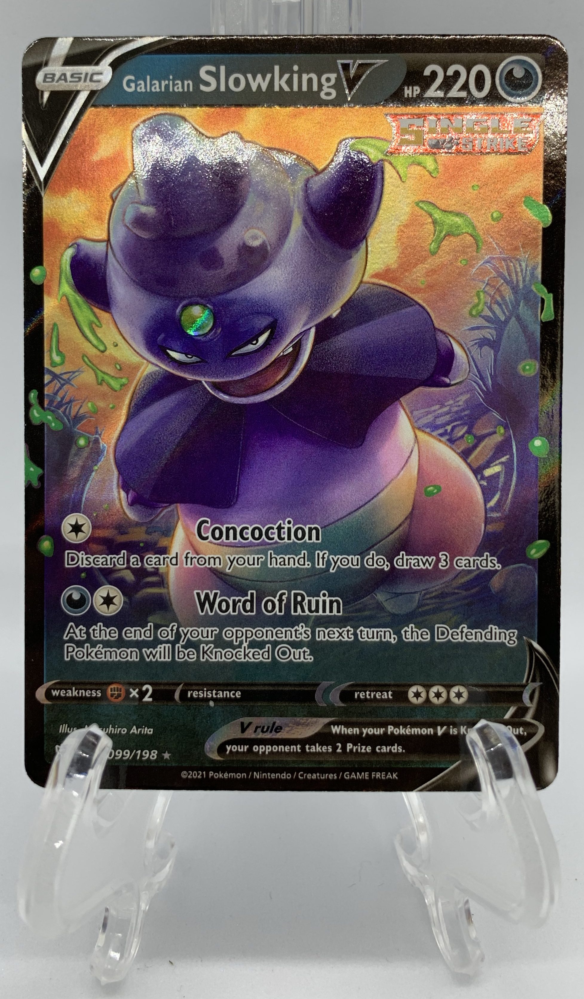 Galarian Slowking is a creepy looking card! It also has a very annoying attack called Word of Ruin. For just two energy, it can wipe out the defending Active Pokemon if it doesn’t move by the end of its turn!