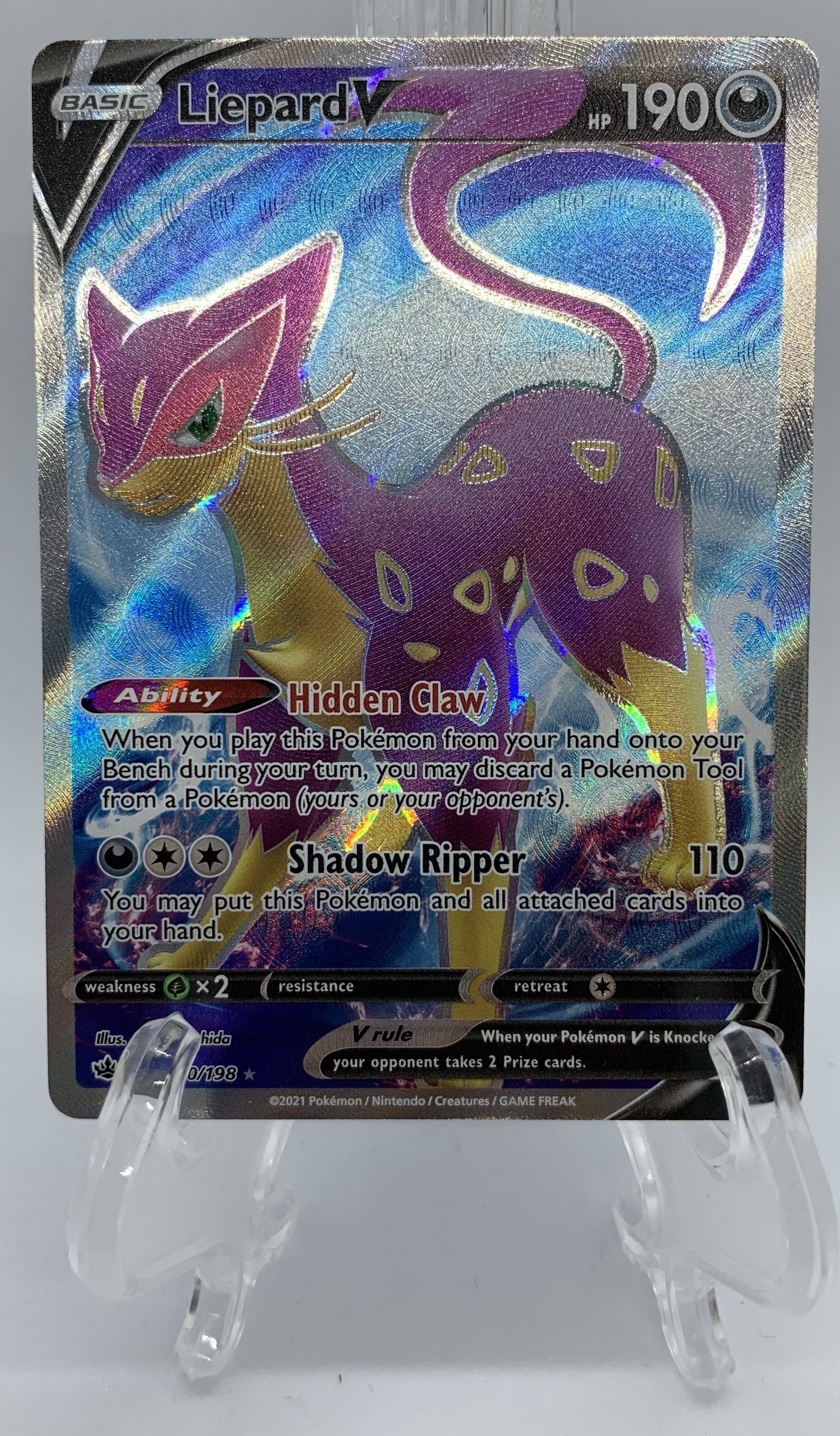 Liepard V was the one full art variant we pulled from Chilling Reign. It’s also only the 2nd full art card in our collection! Its Hidden Claw ability might be a bit too situational for it to be consistently effective, but the ability isn’t bad to have.