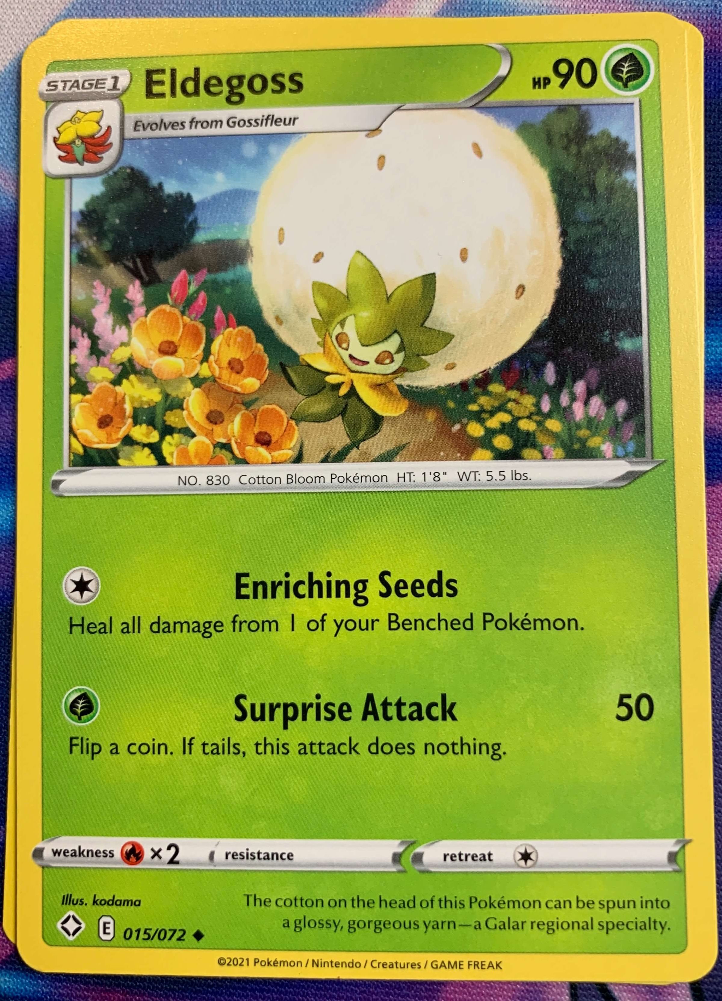 - Eldegoss (021/202 Sword & Shield base set) : Consider adding an extra Eldegoss evolution, but the one from Sword & Shield base set that has the move Blessing of Fluff. This move allows Eldegoss to distribute up to three energy from the deck onto your benched Pokemon in any way you like. This essentially gives you a fully-charged Pokemon ready to attack on your next turn!