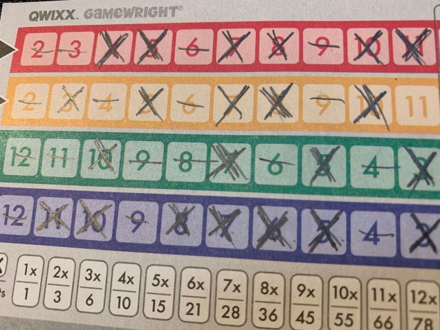 You have the option to pass on either, but you must cross off at least one of the two each turn or face a five-point penalty. Also, once you cross off a number on the track, you can no longer cross off numbers to the left of the one you just crossed off. If you cross off red 7, you can’t cross off red 2-through-6.