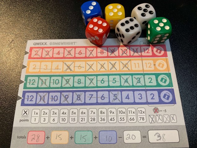 One more thing to note. If a player has crossed off five numbers on a track and the number of the farthest right of that row is called, they can choose to cross off that number and lock the track from future scoring for the entire group.