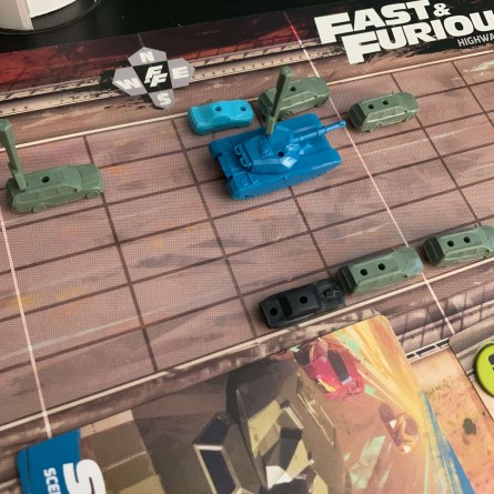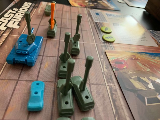 On your turn, you’ll have the ability to perform two actions. There’s a lot to choose from by default, from hopping out of your car to jump onto an enemy vehicle, to ramming enemy vehicles, to hijacking enemy SUVs. While the game is fairly easy to learn, the game provides players with many exciting actions to perform that feel like you’re playing a part in the movies. During one round, I forced an enemy SUV into driving directly in front of a tank. On the next, my wife Steff then drove beside the SUV and rammed it, causing it to flip over and crash into the tank behind it. Awesome!