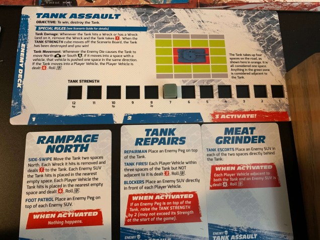 After each player’s turn, enemies fight back. With the roll of an enemy die roll, they might ram into your cars, throw you off of the roof of a moving vehicle, or you might even shot at by the boss vehicle, among many other calamities that can occur.