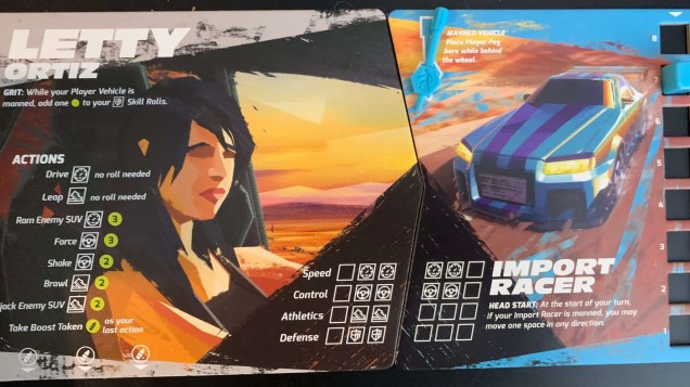 Most skills require dice-based skill checks to perform. Failing the check wastes that action. While die rolls can be tough, there are ways to minimize risk. Based on your combination of character and vehicle, you may be better suited to perform certain tasks, as your attribute totals may give you more dice to roll. You also get access to nitro. When you roll a nitro symbol, you can cash in a nitro token to add that value to your skill check. Other players can spend their nitro tokens to give you extra dice as well. You’re not guaranteed to hit every time, but at least you have ways to work around it. Also, based on the insane stuff you’re doing, it makes thematic sense that actions wouldn’t work every time, even if it makes the game harder.