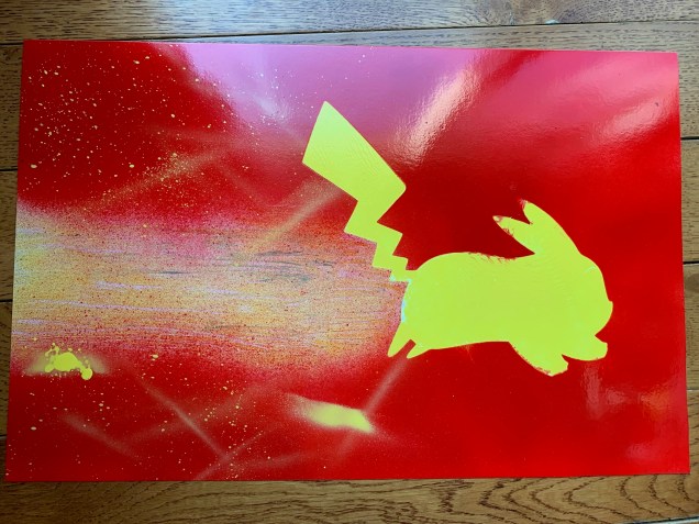 BRONZE – $25 USD or more – Pikachu 4″x6″ spray paint art print PLUS a signed Pokemon card