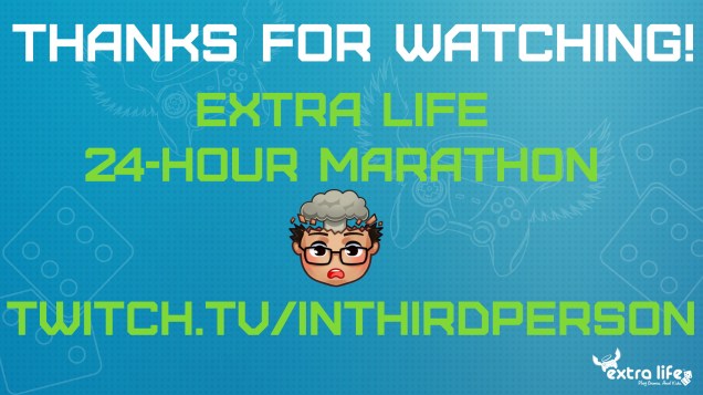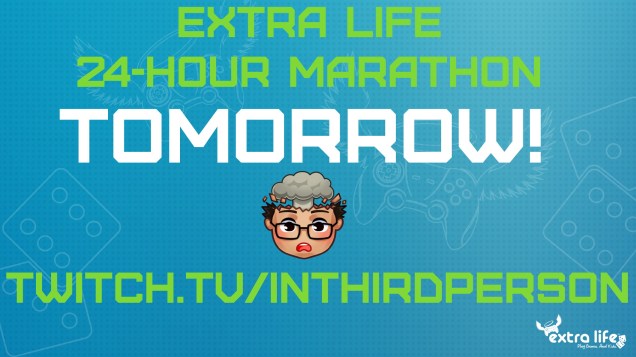 Head over to twitch.tv/inthirdperson right now and join us for our Extra Life 24-hour gaming marathon! Join us for the hype, laughs, and inevitable fails as we play games and try to not fall asleep!